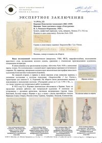 Внимание! Все материалы сайта и базы данных аукционных результатов ARTinvestment.RU, включая иллюстрированные справочные сведения о проданных на аукционах произведениях, предназначены для использования исключительно в информационных, научных, учебных и культурных целях в соответствии со ст. 1274 ГК РФ. Использование в коммерческих целях или с нарушением правил, установленных ГК РФ, не допускается. ARTinvestment.RU не отвечает за содержание материалов, предоставленных третьими лицами. В случае нарушения прав третьих лиц администрация сайта оставляет за собой право удалить их с сайта и из базы данных на основании обращения уполномоченного органа.